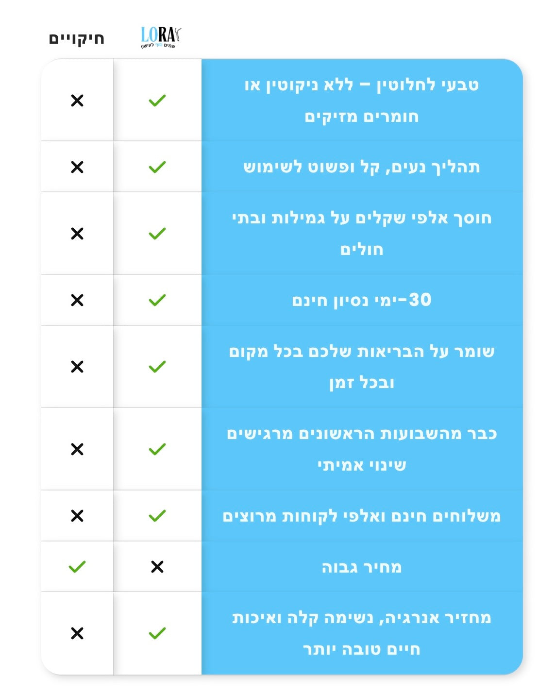 עם LORA מפסיקים לעשן, חוסכים אלפי שקלים בכל שנה ויכולים להשקיע את הכסף בדברים שבאמת חשובים.